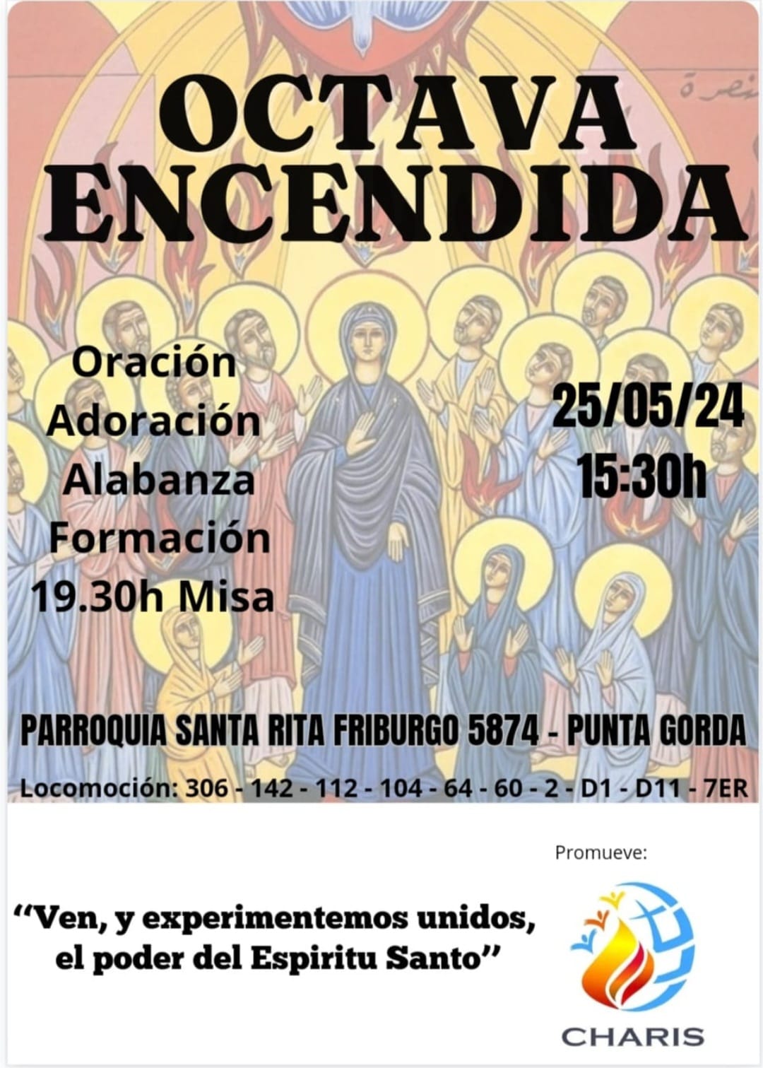 Bajo el lema «Ven, y experimentemos unidos, el poder del Espíritu Santo», integrantes de todo el país se reunirán el sábado 25 de mayo en la parroquia Santa Rita de Casia (Friburgo 5874, Punta Gorda) a las 15:30 horas.