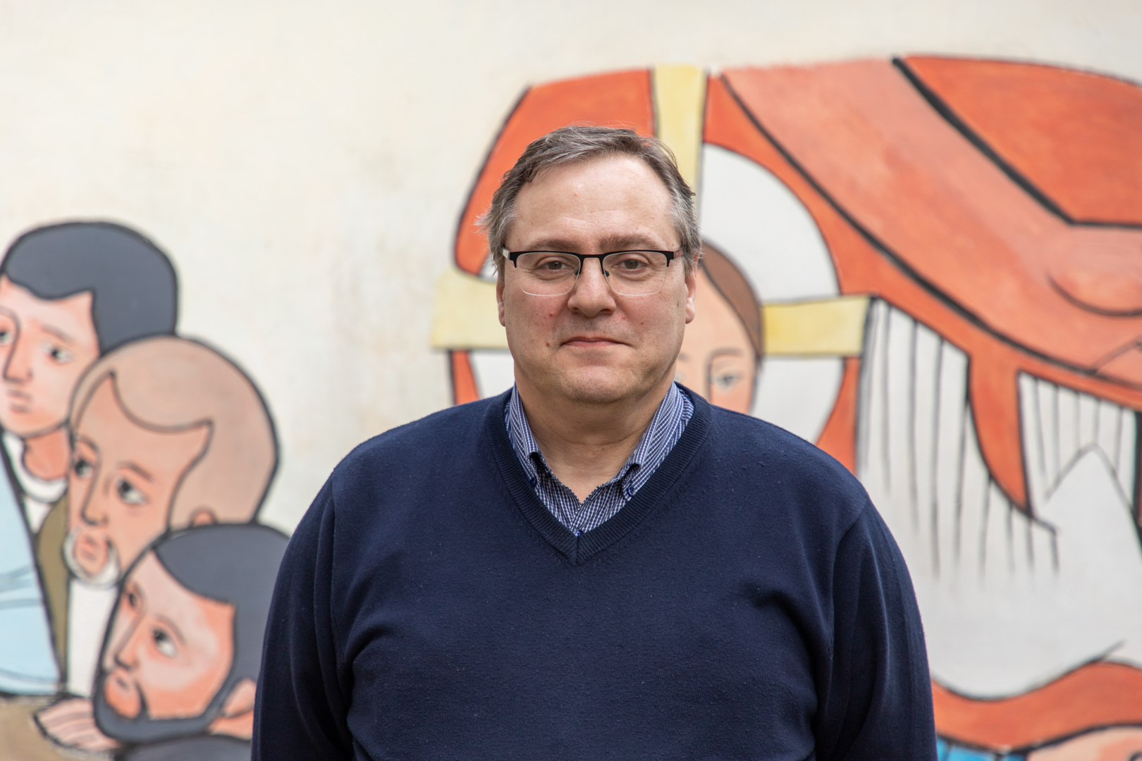 El P. Daniel Martínez en el patio de la parroquia, junto a un mural realizado por Mons. Cotugno en la década del 90. Fuente: R. Fernández