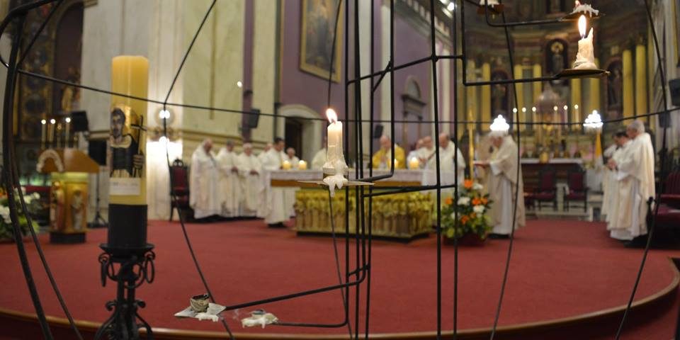Lo acompañaron en el presbiterio el Obispo Auxiliar de la ciudad, Mons. Milton Tróccoli, el Obispo de Minas, Mons. Jaime Fuentes, y el Obispo emérito Mons. Luis del Castillo, junto a otros sacerdotes de la congregación y del clero uruguayo. La Matriz estaba repleta de personas y destacaba la cantidad de familias y niños.